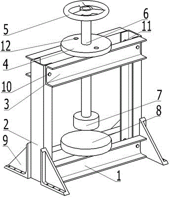 As shown in Fig. 1~Fig. 6, a kind of simple and easy pressure apparatus, comprise bottom support 1, bottom support 1 both sides are for indulging support 2 and a base 9, and vertical support 2 tops are upper support 3, and there is cylindrical cushion block 4 upper support 3 tops, screw rod 6 is vertical through cushion block 4, its upper and lower end is connected with head 7 with handwheel 5 respectively, is cylindrical bar 8 under head 7, and platform 8 is fixed in bottom support 1.Bottom support 1, vertical support 2 and upper support 3 adopt channel-section steels, and bottom support 1 is that two notches are opposing, the channel-section steel that spaced and parallel is placed in interval is two and vertically supports 2, upper support 3 is also to consist of two notch channel-section steels opposing and that spaced and parallel is placed.Propping up base 9 is four leg-of-mutton steel components, is welded in respectively between two vertical support on 2.Vertical support 2 links together with base support 1 and upper support 3 respectively by bolt 10 and nut 11.