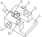 如图1所示,本实用新型包括数个相互配合的底座1,各底座1上带有U形凸台2,凸台2中间的U形槽底部及侧壁均带有安装孔,所述安装孔内分别装有钢套4,所述侧壁上的安装孔内安装有调节螺母3,调节螺母3与钢套4采用螺纹配合,有利于控制其进给调节精度,所述底部的安装孔内安装曲柄轴5,调节螺母3顶部顶住曲柄轴5顶部的台面,钢套4与曲柄轴5采用间隙配合,方便加工后的拆卸;底座1的底面带有定位孔,凸台2的顶面带有定位销6,上下两个底座1之间通过所述定位孔与所述定位销6定位配合,能够同时从下至下对多个曲柄轴进行腰形孔线切割加工,并且保证同样的精度要求;