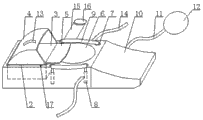 With reference to Fig. 1, defecation nursing device, comprise vessel 1, described vessel 1 is provided with groove 2, in described groove 2, be movably equipped with the emiction vessel 3 that top has opening, the top of described emiction vessel 3 tilts to be provided with the arc urine blocking cover 4 being fixedly connected with emiction vessel 3, and the opening part of described emiction vessel 3 rotates and is provided with the urine lid 5 airtight with emiction vessel 3; Described vessel 1 is provided with stool chamber 6, the both sides that are positioned at stool chamber 6 on described vessel 1 are provided with multiple shrinkage pools 7, in described shrinkage pool 7, be provided with cylinder 8, between adjacent two cylinders 8, be provided with the seat board 9 for placing thigh, described vessel is provided with the switch 17 for control cylinder 8 liftings, and described urine lid 5 is communicated with urine chamber and the stool chamber 6 of described emiction vessel 3; One side of described vessel 1 is positioned at waist location and is provided with waist adjusting utricule 10, and described waist regulates utricule 10 to be connected with air bag 12 by flexible pipe 11.