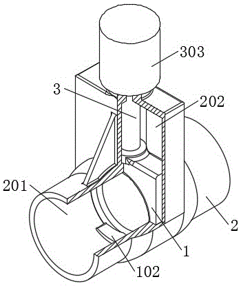图中:1闸板、101密封环、102压板、103密封板、2阀体、201流体腔、202闸板腔、203密封槽、204螺纹通孔、205泄压通孔、206泄压通道、207连通管、208泄压孔、3传动轴、301螺纹柱、302光柱、303电机。In the figure: 1 gate, 101 sealing ring, 102 pressing plate, 103 sealing plate, 2 valve body, 201 fluid chamber, 202 gate chamber, 203 sealing groove, 204 threaded through hole, 205 pressure relief through hole, 206 pressure relief channel , 207 connecting pipe, 208 pressure relief hole, 3 drive shaft, 301 threaded column, 302 light column, 303 motor.