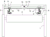 驱动装置,所述驱动装置用于驱动两个移动板4相对移动,其包括顶板7、滑轨8、滑块9、移动块10、丝杆螺母11、丝杆,所述顶板7水平固接在两个立板3顶端,所述滑轨8水平固接在顶板7底面,所述滑块9设有两个,所述移动块10设有两个且分别固接在两个滑块9上,其与所述移动板4顶端固接,所述丝杆螺母11设有两个且分别嵌装在两个移动块10上,所述丝杆水平转动连接在立板3上,其长度方向两端分别设有螺纹旋向相反的第一螺纹部12、第二螺纹部13,两个所述丝杆螺母11分别螺纹套装在第一螺纹部12、第二螺纹部13上。