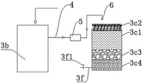 进一步地,如图4所示,蚯蚓生态湿地3c为一个适当面积的形状不规则的湿地,所述蚯蚓生态湿地3c包括自上而下设置的蚯蚓活动土壤层3c1、砂石层3c3和过滤层3c4,蚯蚓活动土壤层3c1内有蚯蚓,所述蚯蚓活动土壤层3c1的表面种植有表面植物3c2,处理水质,所述出水口3f处安装有阀门3f1,砂石层3c3和过滤层3c4为不同粒径的砂石组成,砂石层3c3的粒径较小,而过滤层3c4的粒径较大,消除可能由湿地本身带来的固体杂质。蚯蚓生态湿地3c为一个适当面积的形状不规则的湿地,蚯蚓生态湿地3c是根据蚯蚓具有提高土壤通气透水性能和促进有机物分解转化等生态功能而设计,集物理过滤、吸附、好氧分解和污泥处理等功能于一身,利用滤料截留、蚯蚓和微生物分解利用污水及污泥中的有机物和营养物并具有促进含氮物质的硝化与反硝化作用,是一种生态型污水污泥同步处理新技术。在蚯蚓生态湿地3c内蚯蚓和微生物可形成较好的协同作用,一方面延长了生物的食物链,丰富了微生物的种类,从而强化了对有机污染物质、氮磷的去除作用;另一方面,由于蚯蚓的活动,滤池中滤料有较好的渗透性可明显提高蚯蚓生态滤池的水力负荷,蚯蚓的蠕动可以很好地促进土壤富氧量的提高从而促进植物高效利用土壤中的污染物。此外,蚯蚓生态湿地3c内生物污泥稳定,其毛细吸水时间约在30-50s之间,污泥脱水性能好,较常规活性污泥法处理技术,可大大地减小污泥处理的费用。污水中有机物通过过滤、吸附、吸收作用,促进兼性微生物分解来实现对污水的高效净化,具有效果好、投资省、运行费低、应用效果好、提高了出水质量、负荷稳定、结构简捷、无需三相分离器、无污泥回流和鼓风曝气设备、无动力消耗、运行管理简捷方便、景观和生态效应好等特点。
