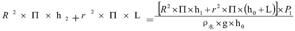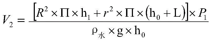 As shown in FIG. 5, when the water pump continues to pump the liquid in the vacuum check valve, the volume of the space above the liquid level in the vacuum check valve exceeds the critical value V2To V2' (i.e., V)2’>V2) When the vacuum check valve is used, liquid in the drainage tube is sucked into the vacuum check valve from the liquid supply pool. The radius r of the drainage tube and the length L + h of the drainage tube can be known0Radius R of vacuum check valve body and liquid level h1When known, it can be found that2Height h under the condition2. In actual design at h2On the basis of the method, the safety allowable redundancy is added, so that the liquid to be pumped can be ensured to be sucked into a liquid storage tank (equivalent to a vacuum check valve) from a drainage tube, the cavitation of a water pump is prevented, and the liquid can be continuously and circularly supplied to the centrifugal pump. The method has strong feasibility in the implementation of specific projects.