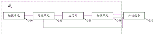 在一个实施例中,所述主芯片包括控制接口,所述主芯片还通过所述控制接口与所述切换单元连接,用于传输控制所述切换单元切换与外接设备的通道的通断的信号。本实施例中,主芯片通过一个控制接口与切换单元连接,这样,主芯片与切换单元之间具有两路通信通道,一路通信通道用于传输触摸数据,另一路通信通道用于传输控制信号,切换单元接收到控制信号后能够切换选择哪一路通道导通,主芯片则将触摸数据发送给通道导通的外接设备。这样,能够有效控制切换单元对主芯片与外接设备之间通道的切换,确保能够切换到对应的外接设备。本实施例的特征可以与其他实施例的特征进行任意组合,只要特征之间的组合不存在冲突或者矛盾,但是限于篇幅,未进行一一描述。以下以几个组合实施例进行示例说明,例如,在一个组合实施例中,触摸单元与处理单元之间、主芯片与切换单元之间以及切换单元与外接设备之间均通过USB接口连接,用于传输触摸数据,且主芯片的控制接口还与切换单元连接,用于传输控制切换单元切换与外接设备的通道的通断的信号。又如,主芯片与处理单元通过SPI接口连接,主芯片与切换单元之间通过OTG USB接口连接,用于传输触摸数据,且主芯片的控制接口还与切换单元连接,用于传输控制所述切换单元切换与外接设备的通道的通断的信号。在一个实施例中,所述控制接口为GPIO(GeneralPurpose Input Output,通用输入/输出)接口。采用GPIO接口发送控制信号,能够有效降低功耗。本说明书其他任意实施例中的控制接口均可以为GPIO接口。In one embodiment, the main chip includes a control interface, and the main chip is further connected to the switching unit through the control interface, and is used to transmit a signal for controlling the switching unit to switch on and off a channel of an external device. . In this embodiment, the main chip is connected to the switching unit through a control interface, so that there are two communication channels between the main chip and the switching unit, one communication channel is used to transmit touch data, and the other communication channel is used to transmit control signals. After the switching unit receives the control signal, it can switch to select which channel is turned on, and the main chip sends the touch data to the external device whose channel is turned on. In this way, the switching unit can effectively control the switching of the channel between the main chip and the external device, so as to ensure that the corresponding external device can be switched. The features of this embodiment can be arbitrarily combined with the features of other embodiments, as long as there is no conflict or contradiction between the combinations of the features, but due to space limitations, they are not described one by one. Several combined embodiments are used for illustration below. For example, in one combined embodiment, the touch unit and the processing unit, between the main chip and the switching unit, and between the switching unit and the external device are all connected through a USB interface. It is used for transmitting touch data, and the control interface of the main chip is also connected with the switching unit, and is used for transmitting the signal for controlling the switching unit to switch the channel on and off with the external device. In another example, the main chip and the processing unit are connected through the SPI interface, and the main chip and the switching unit are connected through the OTG USB interface for transmitting touch data, and the control interface of the main chip is also connected with the switching unit for transmitting the control The switching unit switches the on-off signal of the channel with the external device. In one embodiment, the control interface is a GPIO (General Purpose Input Output, general input/output) interface. Using the GPIO interface to send control signals can effectively reduce power consumption. The control interface in any other embodiment of this specification may be a GPIO interface.
