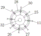 如图2、图3、图4所示,所述旋转式变速水流成型单元包括进水筒25、连接管27、连接头26、旋转筒31、环形槽28、第三出水孔29、喷管30、喷头11、连接板23、旋转轴21、伺服电机20、第三支座19、安装板22。