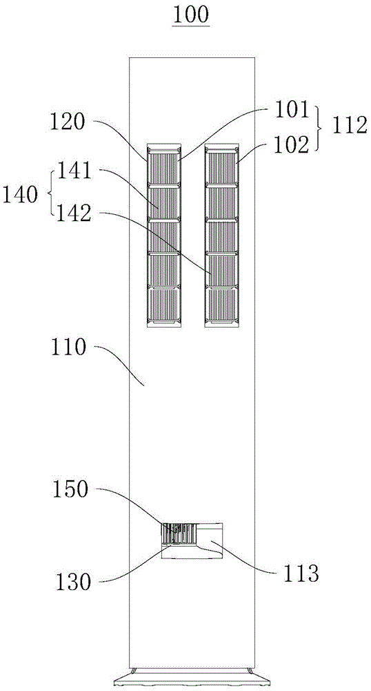 图1为本实施例所述的上下出风的空调器100的第一视角的结构示意图。请参照图1,本实施例提供了一种上下出风的空调器100能够有效解决上述问题。FIG. 1 is a schematic structural diagram of the