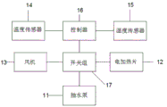 frame (1) inboard both ends all are provided with electrical heating piece (12), the top of electrical heating piece (12) all is provided with fan (13), one of them the below of fan (13) is provided with temperature sensor (14) and humidity transducer (15), another the below of fan (13) is provided with controller (16) and switch group (17), switch group (17) electricity respectively is connected fan (13) electrical heating piece (12) with suction pump (11), controller (16) electricity respectively is connected temperature sensor (14), humidity transducer (15) with switch group (17).