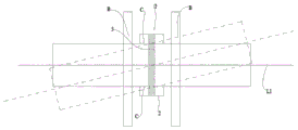 As shown in fig. 4 and 5, in this embodiment, the horizontal end face a of the L-shaped clamping support slider 2 and the top face B of the clamping device support base 3 are located on the same horizontal plane, when the long-rod workpiece is clamped by self-centering, the long-rod workpiece is firstly placed on the top face B of the clamping device support base 3 by hoisting, the top face B has a supporting function on the long-rod workpiece, then the clamping device power source 1 is controlled to provide power to drive the pair of L-shaped clamping support sliders 2 to move closer together relatively through the clamping device transmission mechanism 4, the long-rod workpiece is clamped by the vertical face C through the relative movement of the pair of L-shaped clamping support sliders 2, so that the structural central axis L1 of the long-rod workpiece is parallel to the vertical face C of the L-shaped clamping support slider 2, and the structural center position of the long-rod member. In the whole process, hoisting or manual support is not needed; the L-shaped structural design of the L-shaped clamping and supporting slide block 2 can be well matched with the plane end of a workpiece.