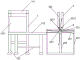 The conveying unit 2 is arranged at the other end of the second conveying belt 102, is positioned on the same straight line with the second conveying belt 102, and consists of a conveying unit rack 202, a conveying plate 201, a motor 203 and a conveying pulley 2011 arranged in the middle of the conveying plate, the conveying plate 201 is arranged on the conveying unit rack 202, the motor 203 drives the conveying plate to rotate, the conveying plate 201 consists of two blocks, and the conveying pulley 2011 is arranged in the middle of the conveying plate 201.
