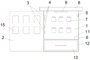 In this embodiment, be provided with in the box 1 and be horizontal division board 10, division board 10 will box 1 is separated into first cavity 11 and is located second cavity 12 of first cavity 11 below, the ammeter 7 the vent 5 hot-air fan 3 radiator fan 4 controller 6 lighting device 9 reaches acoustic control switch all sets up in first cavity 11, lighting device 9 sets up on the up end of first cavity 11, sliding fit has drawer 13 in the second cavity 12, be provided with the toolbox in the drawer 13. The setting up of toolbox makes operating personnel can directly use the instrument of toolbox does not need self to carry the instrument, makes the utility model discloses a use more convenient.