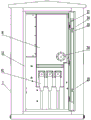 Install first hinge 121 and second hinge 122 between switch room door 12 and the cabinet body 1, the one end of first hinge 121 articulates on the cabinet body 1, the other end of first hinge 121 and the one end of second hinge 122 are articulated, the other end of second hinge 122 articulates on switch room door 12, when opening switch room door 12, the degree of opening and shutting of switch room door 12 can be fixed a position to first hinge 121 and second hinge 122, to windowing the same, avoid switch room door 12 to rock.