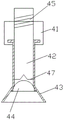 请参阅图4-6,为使得支撑架的充气和放气更便捷,对气嘴4做进一步改进。在本实施例中,所述气嘴4设于所述气囊上,作为支撑架的进气口。当然,气嘴也可设置在任意支撑杆上(如图3所示)。所述气嘴4包括一通气管42、与通气管配合的转动螺母41和卡设于转动螺母内的漏斗状接头43,所述通气管一端的外表面上设有螺纹45,所述转动螺母与螺纹配合以进行位置调节,通气管的另一端设有延伸至漏斗状接头内的挤压头47,所述漏斗状接头43的前端设有与挤压头进行配合对接的气塞44,所述气塞44通过弹性橡胶46与漏斗状接头的内壁固定连接。通过转动螺母与通气管42内的螺纹进行调节位置,1)旋转转动螺母41使得挤压头在漏斗状接头内的位置往气塞方向推进,在顶住气塞44后,继续推动气塞44,使得气塞与漏斗状接头43 之间形成进气通道,即可对支撑架进行放气,也可自通气管42充入气体;2) 将转动螺母往反方向旋转使得进气管退回,由于弹性橡胶46的复位功能,气塞44在弹性橡胶46回复力的带动及内在气压作用下进行复位,堵住漏斗状接头43,即可封住气嘴,防止支撑架内部气体从气嘴4泄漏。该气嘴操作方便,通过调整转动螺母41即可切换支撑架的储气和放气状态。