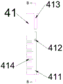 In a specific embodiment, the fixing base 41 is disposed on a center line of the detection platform 11 in the width direction and located at a side close to the transverse sliding hole 236, vertical sliding slots 411 are disposed on two sides of the fixing base 41 in the height direction, and sliding columns 412 are disposed in the vertical sliding slots 411; the clamping plate 42 is provided with a concave opening 421, the fixing seat 41 is located in the concave opening 421, and the left end and the right end of the concave opening 421 are respectively connected with the sliding column 412 in a rotating manner. The top of the fixing base 41 is further provided with a groove 413 which can be inserted into the concave opening 421.