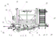 8. The gantry type pullup wheel beet harvester of claim 1, wherein: the front and rear forklift lifting gantries (13, 15) are fixedly connected on the frame, the inner frames of the front and rear forklift lifting gantries (13, 15) slide up and down in the track under the synchronous action of the oil cylinders, and the collecting boxes (14) connected with the lower ends of the inner frames of the front and rear forklift lifting gantries (13, 15) run up and down synchronously, so that the lifting and unloading are realized.