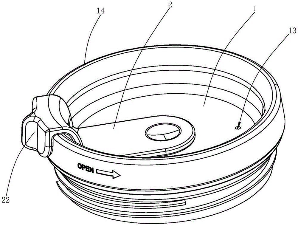 specifically, in this embodiment, the top surface of the lid body 1 further has an annular wall 14 formed along the edge direction of the lid body and extending upward, the rotation shaft hole 11, the water outlet hole 12 and the air inlet hole 13 are all located on the inner side of the annular wall 14, the toggle part 22 has a locking groove 220 locked on the annular wall 14 in a matching manner, and the toggle part 22 can slidably move along the annular wall 14 through the locking groove 220 and the annular wall 14 in a matching manner. As regards the structure of the knob part 2 and the toggle part 22, reference is made to fig. 5 and 6;