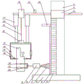 wherein: 1-crane body, 2-steering box, 3-boom, 4-ascending ladder, 5-conveyor belt, 6-base, 7-cross bar, 8-support bar, 9-take-up box, 10-baffle, 11-stopper, 12-lifting box, 13-hydraulic cylinder, 14-hydraulic rod, 15-connecting rope, 16-hanger plate, 17-double limb column, 18-rolling wheel, 19-take-up box, 20-clamp, 21-support plate, 22-clamp plate, 23-motor, 24-double link, 25-rivet, 26-connecting block, 27-loop bar.