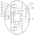 输送筒8内壁的上表面和下表面均卡接有轴承9,且两个轴承9内套接有同一个螺旋轴10,通过设置螺旋轴10,使得螺旋轴10转动可以将输送筒8底部的固体粪便输送到输送筒8顶部,且螺旋轴10的螺旋输送具有密封性好、便于封闭运输和操作方便等优点,螺旋轴10的顶端与输送筒8上表面固定连接的驱动装置11的输出端固定连接,驱动装置11包括电机111,电机111的输出轴与螺旋轴10的顶端固定连接,电机111固定连接在机箱112内,机箱112固定连接在输送筒8的上表面,通过设置机箱112,使得机箱112可以为电机111进行遮罩,避免了灰尘或者一些杂物飘入电机111而对电机111造成损坏的问题,保障了电机111的正常使用寿命,输送筒8内壁的左侧面与固体粪便排放管12的左端相连通,养殖室本体1内壁的正面和背面均卡接有滑槽13,滑槽13内固定连接有滑块14,通过滑槽13和滑块14之间的相互配合,不仅可以为移动板15的移动提供一个支撑点,还使得移动板15带动高压喷头组19左右移动的同时可以带动滑块14在滑槽13内左右移动,从而使得工作人员通过把手16拉动或者推动移动板15和高压喷头组19移动更加方便省力而且稳定,且两个滑块14通过同一个移动板15固定连接,移动板15的左侧面设置有把手16,把手16为内嵌式把手,把手16的外表面设置有防滑纹,通过将把手16设置为内嵌式把手16,且在把手16外设置防滑纹,从而可以增大工作人员手掌和把手16之间的摩擦力,使得工作人员通过把手16拉动移动板15更加方便省力,而且内嵌式把手16的设计可以避免牲畜碰撞所对牲畜造成的伤害,移动板15的右侧面与养殖室本体1内壁的右侧面均卡接有磁铁17,且四个磁铁17两两相吸,通过设置磁铁17,使得在不需要对养殖室本体1进行消毒清洗时,工作人员可以将高压喷头组19推入凹槽18内,使得移动板15与养殖室本体1内部接触,使得四个磁铁17两两相吸可以对移动板15和高压喷头组19的位置进行固定,养殖室本体1内壁的右侧面与移动板15的右侧面相对应的位置开设有凹槽18。
