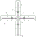 The cross mounting plate 1 is provided with four transmission mechanisms, one ends of the four transmission mechanisms opposite to each other are fixedly connected with first bevel gears 9, each transmission mechanism comprises a first fixed block 6 and a second fixed block 7 which are fixed on the cross mounting plate 1, and the first fixed block 6 and the second fixed block 7 are connected with the cross mounting plate 1 through welding; a screw 8 is rotatably connected to the first fixing block 6, the screw 8 penetrates through the sliding block 3 and is in threaded connection with the sliding block, and a threaded hole matched with the screw 8 penetrates through the sliding block 3; the screw 8 penetrates through the second fixing block 7 and is in rotary connection with the second fixing block 7, a bearing is mounted on the second fixing block 7, and the screw 8 is in rotary connection with the second fixing block 7 through the bearing; the first bevel gear 9 is fixedly connected with one end of the screw 8 close to the second fixed block 7, as shown in fig. 2.