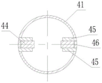 锥体钻头40是锥体外管Ⅰ41上固定缠绕两条对称的钻头挤土叶片42,钻头挤土叶片 42可以制成如图8所示的外缘无挤土缺口的叶片,也可以制成如图9所示的外缘有挤土缺口Ⅳ48的叶片。本实施例选择制成外缘无挤土缺口的叶片。锥体外管Ⅰ41的下端设有活动连接的钻尖装置。本实施例所述钻尖装置由可伸缩的内管堵板Ⅲ43c和中部制成缺口44a的滑移板44构成。如图12所示,在锥体外管Ⅰ41内腔对称设有由两块固定板45沿轴向形成的滑槽46,滑移板44沿滑槽46上下移动。内管堵板Ⅲ43c设置在滑移板44的下端,通过滑移板44的上下移动带动内管堵板Ⅲ43c和内管50的闭合和张开。定位销47固定在锥体外管Ⅰ41上用于限位滑移板44下降的最大位置。