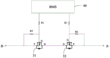 As shown in fig. 2, the MOS switch 30 in this embodiment includes a first MOS transistor 31 and a second MOS transistor 32 connected to the battery management system, wherein a gate of the first MOS transistor 31 and a gate of the second MOS transistor 32 are respectively connected to the battery management system 40, a source of the first MOS transistor 31 and a source of the second MOS transistor 32 are respectively connected to the battery pack 10 and the negative terminal P-, and a drain of the first MOS transistor 31 and a drain of the second MOS transistor 32 are connected to each other.