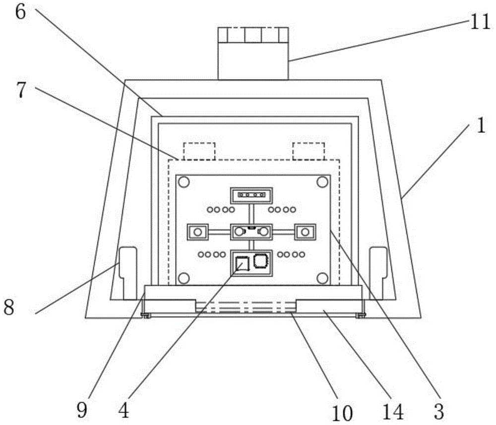 工作时若主板模块3出现损坏或需更换安装SD卡,先将固定板14两侧的滑块向中间推动,取下固定板14,然后将工字形把手10向下拉可以把主板模块3通过主板底座9拉出,更换检查,安装时反操作即可。If the