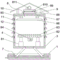 图中:1、底座;2、伸缩套;3、柜体;4、挡水板;5、柜门;6、把手;7、防水升降组件;8、除尘散热组件;9、支撑杆;10、顶盖;11、通风口;12、防尘网;71、连接槽;72、滑槽;73、正反牙丝杆;74、转轮;75、滑板;76、连杆;81、液压杆;82、积风管;83、出风喷头;84、鼓风机;85、固定杆;86、导流罩;87、连接管;88、除尘箱;89、滑轨;810、除尘滤布;811、抽风机。