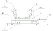 请参阅图2,其是图1所示的桥壳铣面钻孔夹具的夹紧机构在竖直面上的剖视图,所述夹紧机构40包括支撑滑座41、固定夹紧座42、滑动夹紧座43、第一夹紧块44、第二夹紧块45和第一驱动油缸46,两所述支撑滑座41分别设置在两所述螺母22上,所述支撑滑座41上设有垂直于所述第一导轨30延伸的滑槽,所述固定夹紧座42固设于所述滑槽末端,所述滑动夹紧座43可沿所述滑槽滑动地设置在所述支撑滑座41上,所述第一夹紧块44可拆卸地设置在所述固定夹紧座42上,所述第二夹紧块45可拆卸地设置在所述滑动夹紧座43上,所述第一驱动油缸46的输出端与所述滑动夹紧座43固定连接,通过快速更换固定夹紧座42和滑动夹紧座43上的第一夹紧块44和第二夹紧块45能够适应各种不同型号的桥壳。请参阅图3,其是图2所示的夹紧机构的夹紧滑座的结构示意图,在本实施例中,滑槽由平行竖立在支撑滑座41上的两个条状板411构成,滑动夹紧座43架设在条状板411上方,滑动夹紧座43的底部伸入到滑槽内,由第一驱动油缸46的输出端通过油缸接头与滑动夹紧座43固定连接,第一驱动油缸46推动滑动夹紧座43的底部使滑动夹紧座43沿滑槽滑动。当然,在一些实施方式中,也可以不使用固定夹紧座42和滑动夹紧座43,而直接将所述第一夹紧块44设于所述滑槽末端,所述第二夹紧块45可沿所述滑槽滑动地设置在所述支撑滑座41上,所述第一驱动油缸46设于所述支撑滑座41上并且其输出端与所述第二夹紧块45固定连接。