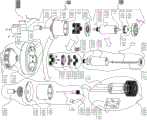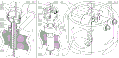 图5展示的则是本发明提供的加捻装置的第一实施例的分步拆解示意图,为节省附图占用文档页面的空间所以图5为横向放置,所以请顺着附图标记的观察角度来观看图5。本图左侧展示的是将该实施例的加捻装置拆分为几个主要的核心部件时的效果图,各个核心部件进一步拆解的效果图则在本图中以弧形箭头指示的各个虚线包围圈内的图形进行展示,本图右上角还以透视图的形式放大展示了所述转轴18和紧固插装于其上的所述导纱块1801的技术特征,本图最下方则利用图中的空白区域放大展示了利用隔空磁力对所述中轴21实施固定操作的所述中轴固定件2102和与其配套的磁性吸引圈2103的一些技术特征。Fig. 5 shows a step-by-step dismantling schematic diagram of the first embodiment of the twisting device provided by the present invention. In order to save the space of the document page occupied by the accompanying drawings, Fig. 5 is placed horizontally, so please observe the reference signs. View Figure 5 from an angle. The left side of the figure shows the effect diagram when the twisting device of this embodiment is disassembled into several main core components, and the effect diagram of the further disassembly of each core component is indicated by the arc arrow The figure in the circle enclosed by the dotted line is shown. The upper right corner of the figure also shows the technical characteristics of the rotating shaft 18 and the yarn guide block 1801 fastened and inserted thereon in the form of a perspective view. The blank area in the figure is enlarged to show some technical features of the central shaft fixing member 2102 and the magnetic attraction ring 2103 matched with the central shaft fixing member 2102 for fixing the central shaft 21 by using space magnetic force.