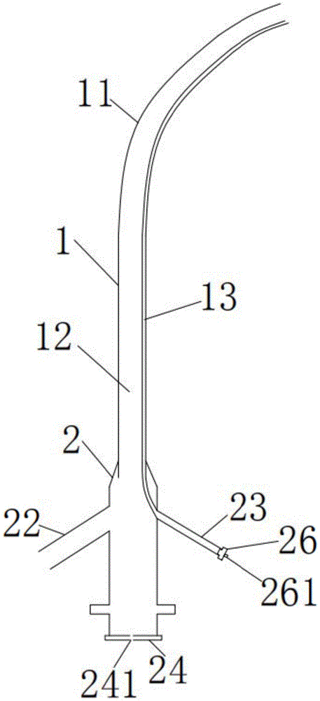 图中:1-外鞘管、2-安装管、3-扩张管、11-弯曲管部、12-主腔道,13-副腔道、21-第一管口、22-第二管口、23-第三管口、24-橡胶封帽、241-封帽圆孔、25-卡勾、26-单向阀、261-注射器接口。In the figure: 1-outer sheath tube, 2-installation tube, 3-expansion tube, 11-curved tube part, 12-main lumen, 13-auxiliary lumen, 21-first nozzle, 22-second nozzle , 23-Third nozzle, 24-Rubber cap, 241-Cap round hole, 25-Hook, 26-Check valve, 261-Syringe interface.