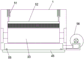 1.一种自动清洁梳棉机,包括机箱(1)、传动装置(2)和梳棉装置(3);所述机箱(1)的两侧分别设有进料口(11)与出料口(12);其特征在于,还包括清洁装置;所述传动装置(2)包括电机(21)、传动轮(22)和传动带(23);所述传动轮(22)连接在电机(21)上;所述梳棉装置(3)包括刺辊(31)、锡林(32)和道夫(33);所述刺辊(31)、锡林(32)和道夫(33)均与机箱(1)转动连接,且该刺辊(31)、锡林(32)和道夫(33)之间依次传动连接;所述传动带(23)的一端传动轮(22),另一端连接刺辊(31);所述清洁装置包括喷洒机构(4)和吸尘机构(5);所述喷洒机构(4)包括水箱(41)、输水管道(42)、喷头(43)和废水收集槽(44);所述水箱(41)固定在机箱(1)上;所述输水管道(42)设置在机箱(1)的顶部;所述喷头(43)与输水管道(42)连接,并且该喷头(43)伸入机箱(1)的内部;所述废水收集槽(44)固定在机箱(1)的底部,该废水收集槽(44)上开有出水口(45);所述吸尘机构(5)位于机箱(1)的内部;所述吸尘机构(5)包括毛刷(51)、气缸(52)、集尘槽(53)和风机(56);所述气缸(52)固定在机箱(1)的顶部;所述毛刷(51)固定在气缸(52)的伸缩杆上;所述集尘槽(53)固定在机箱(1)的底部;所述集尘槽(53)与风机(56)连接;所述机箱(1)上还设有温度感应报警装置(6);所述温度感应报警装置(6)与喷洒机构(4)连接。