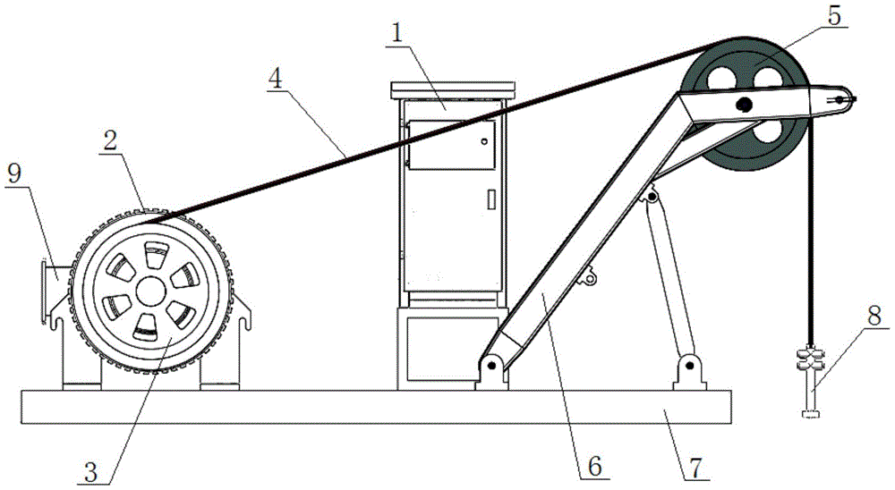 电气控制系统1、电机驱动组件2、带绳双用卷绕筒3、牵引绳4、带绳双用导轮5、导轮支架6、底座7、抽油杆8、制动刹车9。Electrical control system 1, motor drive assembly 2, dual-purpose winding drum 3, traction rope 4, dual-purpose guide wheel 5,