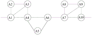 请进一步参见图1和图2所示,图2是本申请提供的第一滤波支路的拓扑结构示意图,第一滤波支路13的第一滤波腔A1与第三滤波腔A3之间、第一滤波腔A1与第四滤波腔A4之间、第四滤波腔A4与第六滤波腔A6之间、第七滤波腔A7与第九滤波腔A9之间以及第七滤波腔A7与第十滤波腔A10之间分别感性交叉耦合,以形成第一滤波支路13的五个感性交叉耦合零点。通常感性交叉耦合元件可以为金属耦合筋,也即第一滤波腔A1与第三滤波腔A3之间设置有金属耦合筋。其中,第一滤波支路13通过设置五个感性交叉耦合零点实现零点抑制,以使第一滤波支路13达到设计要求,便于调试。