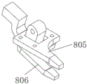 the carrying device 8 comprises a clamping piece 801, a clamping frame 802, a clamping mounting plate 803 and a clamping adjusting plate 804, the clamping frame 802 is a gantry-shaped frame body, a clamping adjusting cylinder is longitudinally mounted on the clamping frame 802, the tail end of a piston rod of the clamping adjusting cylinder is connected with the horizontally arranged clamping adjusting plate 804 to drive the clamping adjusting plate 804 to longitudinally adjust, a clamping piece 801 for clamping door and window materials is movably mounted on the lower plate surface of the clamping adjusting plate 804, the clamping piece 801 is equal to the fixing plate 103 of a clamping mechanism on the conveying frame 102 in number, the clamping piece 801 comprises a shell, a first clamping jaw 805 and a second clamping jaw 806, a mounting groove penetrating through the upper and lower surfaces of the shell is formed in the shell, the first clamping jaw 805 comprises a first connecting plate and a first claw end, the first connecting plate is connected to the lower end of the shell and provided with an opening corresponding to the mounting groove, the first claw end is connected to one end of the first connecting plate far away from the clamping mounting plate 803, the second clamping jaw 806 below the first clamping jaw 805 comprises a second connecting plate and a second claw end, the second connecting plate, the connecting block is arranged on the second connecting plate, the connecting block passes through the opening of the first clamping mechanism, the first clamping jaw, the clamping mechanism, the pressing jaw 3535, the pressing block is connected to drive the pressing block, the pressing mechanism is connected to enable the pressing mechanism to be in the pressing mechanism, the pressing mechanism is connected to be in the pressing mechanism, the pressing mechanism is connected with the pressing mechanism, the pressing.