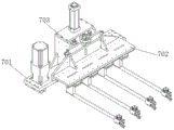 the material loading and conveying frame 1 and the punching and conveying frame 3 are further provided with clamping driving rods, the side faces of the clamping driving rods are provided with teeth, the clamping mechanism 7 comprises a moving plate 701, a clamping adjusting plate 702, a mounting frame 703 and a clamping piece, a clamping driving motor is mounted on the moving plate 701 and is meshed with the teeth of the clamping driving rods through a gear mounted at the tail end of a power shaft of the clamping driving motor, so that the clamping mechanism 7 is driven to move along a first slide rail, the mounting frame 703 is a portal-shaped frame, a clamping cylinder is longitudinally mounted on the mounting frame 703, the clamping adjusting plate 702 is driven to longitudinally adjust through the clamping cylinder, preferably, the clamping adjusting plate 702 is connected with the clamping adjusting plate 702 through two longitudinal plate bodies capable of being adjusted in a staggered mode, so that the height of the clamping adjusting plate 702 can be adjusted in a micro mode and debugging is convenient, the four adjusting pieces are arranged on the bottom face of the clamping adjusting plate 702 at intervals along the length direction of a second slide rail so as to clamp door and window materials, the clamping piece comprises a housing, a first clamping jaw 704, a second clamping jaw 705 and a control cylinder, the housing is cubic, the mounting groove 704 is formed by arranging a first clamping block, the clamping pressing block L, the mounting block is formed by a movable clamping pressing block, the mounting groove is formed by a first clamping block, the mounting groove is formed by a second clamping pressing block, the clamping pressing block is formed by a second clamping pressing block, the clamping block is formed by a second clamping block, the clamping block is fixedly connected with a second clamping block, the clamping block