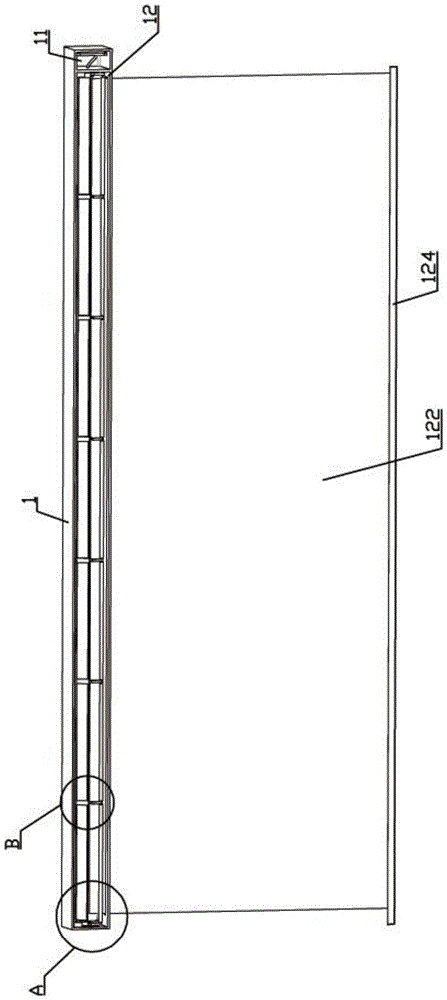 采用本实用新型技术方案,支架2用于将海绵垫21固定;缕空支架5不仅结构稳定而且重量较轻,使得在重力作用下较重的弹性橡胶辊53始终垂直向下,不与幕布122相接触,而较轻的缕空支架5竖直向上也不与幕布122相接触;检测金属片62与固定座61铰接,使得检测金属片62能够围绕固定座61相对转动,在重力的作用下,检测金属片62向下倾斜不与接近开关6相接触,由挡块63进行限位,便于检测金属片62在幕布122堆积于存储腔12后,检测金属片62在幕布122的推动下准确的与接近开关6相接触;当控制板控制幕布122收卷时,控制芯片控制管状电机收卷幕布122,同时控制芯片控制第一电磁铁3通电吸附缕空支架5,缕空支架5带动连接支架52和弹性橡胶辊53围绕连接件41转动,使弹性橡胶辊53轻微推动幕布122,确保幕布122平铺,防止幕布在收卷时皱褶,同时弹性橡胶辊53推动幕布122使得幕布122正面与海绵垫21接触,海绵垫21擦拭幕布122正面使之保持干净;当控制板控制幕布122展开时,第一电磁铁3断电,转动件在重力作用下复位,幕布122在配重块124和管状电机的作用下展开,当幕布122卡在电动幕布内时,幕布122在存储腔12内堆积,使得幕布122推动检测金属片62围绕固定座61向上移动,接近开关6检测到检测金属片62后,控制芯片立即切断管状电机的电源,设备停止工作,直到检测金属片62复位后管状电机才能通电,本实用新型能够监测幕布的展开情况,防止幕布卡在电动幕布内导致电动幕布的损坏,同时在幕布收卷时,将幕布平铺,防止皱褶,并且能够自动清理幕布表面。Adopting the technical solution of the present invention, the