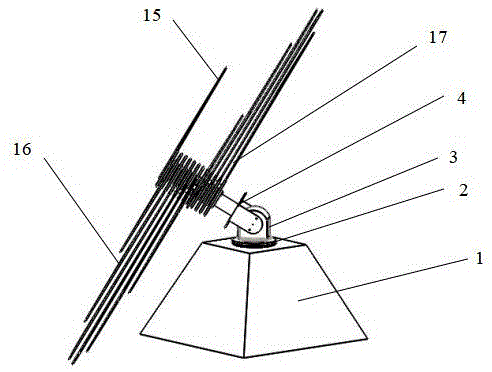 该太阳能采集装置的1个驱动扇叶15包括1个扇形太阳翼18,1个转动盘23,1个支撑导管19,1个推力球轴承20,1个驱动轮盘24;所述驱动轮盘24与扇形太阳翼18圆环部位固定连接,且驱动轮盘24下表面带有键,所述推力球轴承20位于支撑导管19与驱动轮盘24之间,所述驱动扇叶15的支撑导管19下端通过螺纹与从动扇叶16的支撑导管19上端连接,其余从动扇叶16以相同方式连接,且最终从动扇叶17的支撑导管19下端通过螺纹与U形连接件4连接,所述的电机座12固定于最终从动扇叶17的支撑导管19下端的开口内,所述减速电机14固定于电机座12上方,所述转动轴Ⅱ13底端与减速电机14相连,所述驱动轮盘24上表面固定有转动盘23,转动盘23与转动轴Ⅱ13顶端固定连接,通过减速电机14驱动转动轴Ⅱ13旋转带动驱动扇叶15顺时针旋转,从而使驱动轮盘24的下表面的键在从动轮盘21的上表面圆弧槽内移动从而带动从动扇叶16顺时针旋转,其余从动扇叶16以相同方式依次展开。A
