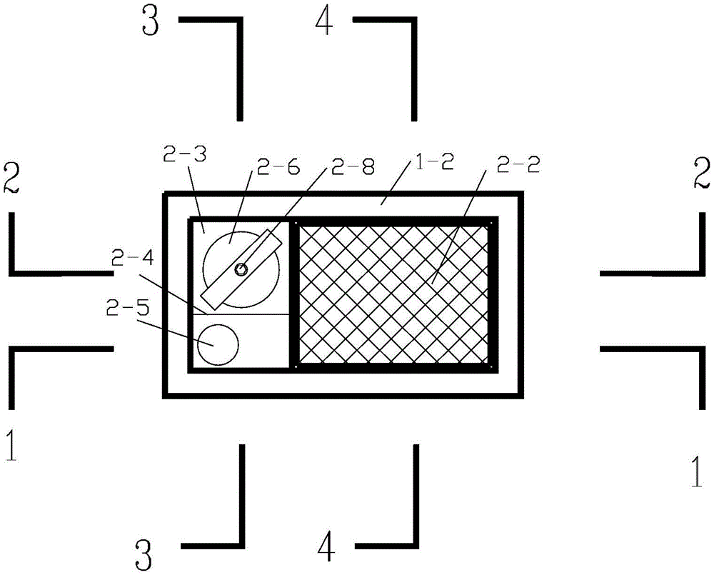 图中:1-1、溢流口;1-2、支撑边沿;2-1、竖隔板Ⅰ;2-2、滤料篮;2-3、顶盖板;2-4、竖隔板Ⅱ;2-5、注水管;2-6、污水入口;2-7、污水入口闸板;2-8、闸杆;2-9、底部封板;2-10、雨水排放口闸板;2-11、污水排放口;2-12、出水弯头;3-1、雨水排放口。In the figure: 1-1, overflow port; 1-2, supporting edge; 2-1, vertical partition I; 2-2, filter basket; 2-3, top cover plate; 2-4, vertical partition II; 2-5, water injection pipe; 2-6, sewage inlet; 2-7, sewage inlet gate; 2-8, gate lever; 2-9, bottom sealing plate; 2-10, rainwater discharge gate; 2-11, sewage discharge outlet; 2-12, outlet elbow; 3-1, rainwater discharge outlet.