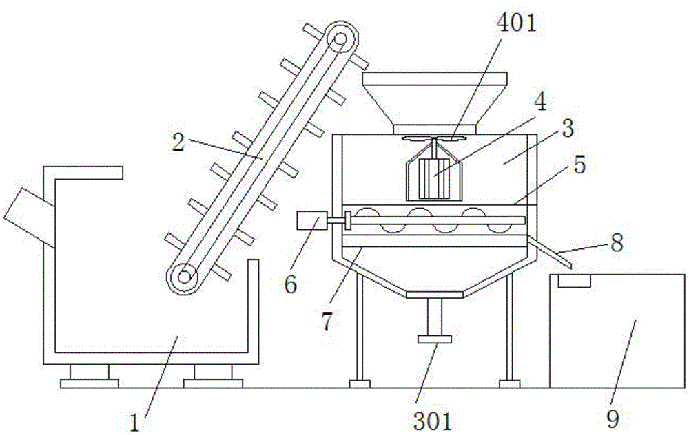 图中:1、渣液混合箱;2、自动上料装置;201、骨架;202、导向辊;203、皮带;204、挂板;205、二号电机;3、固液分离箱;301、排液管;4、一号电机;401、粉碎刀头;5、弧形挡板;6、推料装置; 601、三号电机;602、绞龙;7、过滤网板;701、过滤孔;8、下料板;801、出料口;9、残渣箱。In the figure: 1. Slag-liquid mixing box; 2. Automatic feeding device; 201, skeleton; 202, guide roller; 203, belt; 204, hanging plate; 205, No. 2 motor; 3. Solid-liquid separation box; 301, Drain pipe; 4. Motor No. 1; 401, Crushing cutter head; 5. Arc baffle; 6. Pushing device; 601, Motor No. 3; 602, Auger; 7. Filter screen plate; 701, Filter hole ; 8, blanking plate; 801, discharge port; 9, residue box.