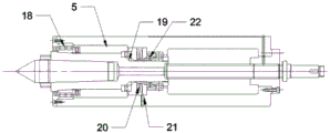 图中:1、尾座套筒本体;2、尾座定位销;3、尾座中心销;4、中心销侧面固定装置;5、中心销固定销套;6、定位销杆;7、销杆凸台;8、尾座连接销杆;9、定位销键槽;10、定位引导端头;11、锥形定位端头;12、锥形尾部端头;13、中心销引导端头;14、装置固定螺栓孔;15、装置固定螺栓;16、密封圈凹槽;17、固定销套密封圈;18、销套活动轴承;19、喇叭渐变口;20、尾端活动轴承润滑凹槽;21、润滑进油口;22、尾端活动轴承。