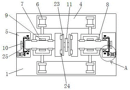 请参阅图1-4,本实用新型提供的一种实施例:一种双工位单卡压管件自动氩弧焊设备,包括底板1、第一支撑架4和第二支撑架5,底板1的上表面四角位置处均固定连接有支撑柱2,四根支撑柱2的上端共同固定连接有顶板3,底板1的上表面前后两侧中间位置处分别固定连接有第一支撑架4,两个第一支撑架4的左右两端分别固定连接有第一气缸6,第一气缸6的伸缩端末端均固定连接有推杆7,推杆7的末端分别固定连接有第一夹块8,通过第一气缸6能够驱动推杆7前后移动,进而使得第一夹块8前后移动,当前后两个第一夹块8同时向中间位置移动时,便可将管件夹紧,防止其焊接时位置发生移动,底板1上位于前后两个推杆7之间固定连接有支撑座9,能够对管件进行支撑,底板1的上表面位于两个支撑座9之间固定连接有隔板11,隔板11的上端左右两侧面分别通过轴承转动连接有固定板23,固定板23的两端远离隔板11的一侧面上固定连接有第二夹块24,通过在隔板11的左右两侧面分别转动设置固定板23,并在固定板23的两端设置第二夹块24,能够对竖向的管件进行夹紧,底板1的上表面左右两端分别固定连接有第二支撑架5,第二支撑架5上固定连接有驱动装置25,通过驱动装置25能够驱动管件转动,方便焊枪20对管件的不同部位进行焊接,顶板3的上表面位于隔板11的左右两侧分别固定连接有第二气缸19,第二气缸19的伸缩端贯穿顶板3并固定连接有焊枪20,通过第二气缸19能够驱动焊枪20上下移动,方便将焊枪20的末端与管件的焊接部位接触以便进行焊接,第一气缸6和第二气缸19的型号均为SC63,为现有技术。Please refer to FIGS. 1-4 , an embodiment provided by the present utility model: an automatic argon arc welding equipment for double-station single-pressing pipe fittings, comprising a
