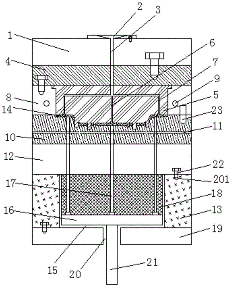 1、上底板;2、浇注口;201、安装孔;3、主流道;4、上垫板;5、凸模;501、限位柱一;502、限位方柱;503、限位柱二;504、限位柱三;6、分流道一;7、分流道二;8、凸模固定板;9、冷却水路一;10、凹模;1001、限位腔;1002、限位孔一;1003、限位方孔;1004、限位孔二;1005、限位孔三;1006、导柱孔;11、冷却水路二;12、下垫板;13、立板;14、产品;15、型腔;16、顶板;17、顶杆;18、弹性体;19、下底板;20、活动孔;21、顶出杆;22、螺丝;23、导柱。1. Upper base plate; 2. Sprue; 201. Mounting hole; 3. Main flow channel; 4. Upper backing plate; 5. Punch; 501, Limit column one; 502, Limit square column; 503, Limit column 2; 504, limit post 3; 6,