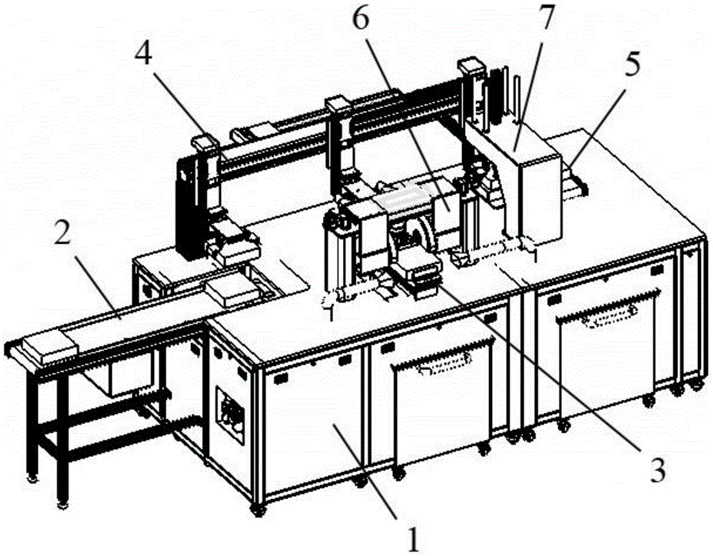 请参阅图1,本实用新型提供了一种方壳电芯自动拆解设备,包括工作台1,工作台1上依次设置有上料线2、移栽机械手模组4、切割移栽模组3、切割模组6、下压顶出模组7和出料线5。Please refer to FIG. 1, the utility model provides an automatic dismantling equipment for square shell cells, including a