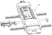 The station transfer mechanism comprises a first ball screw module, a supporting plate, a second ball screw module and a mounting plate, the first ball screw module is arranged on the workbench, the supporting plate is arranged on the first ball screw module, the second ball screw module is arranged on the supporting plate, the mounting plate is arranged on the second ball screw module, the push-up cylinder is fixedly arranged on the mounting plate, and the positioning groove is formed in the upper surface of the mounting plate and corresponds to the moving platform. The first ball screw module and the second ball screw module are matched to enable the mobile platform to move horizontally, and the position of the mobile platform can be adjusted conveniently.