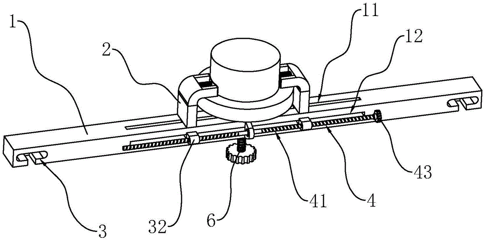 参照图2和图3,为本实用新型公开的一种牵引销适配器,包括安装杆1,安装杆1上靠近两端的位置上均开设有用于安装车架自定中心标尺的安装孔2,安装杆1上设置有两个用于夹持在牵引销周面上的夹板3,两个夹板3对称分布在安装杆1中部的两侧,每个夹板3沿安装杆1的长度方向滑移连接在安装杆1上,安装杆1插向夹板3的侧面上开设有滑道11,滑道11内设置有两个可在滑道11内滑移的滑块31,两个滑块31分别固接在两个夹板3上,安装杆1的前侧面沿其长度方向开设有滑槽12,滑槽12与滑道11内连通,安装杆1的前侧面设置有两个驱动板32,两个驱动板32分别固接在两个滑块31上,安装杆1上设置有驱使两个驱动板32相互远离或靠近的驱动组件4。2 and 3, it is a traction pin adapter disclosed by the utility model, including a mounting rod 1, and the mounting rod 1 is provided with mounting