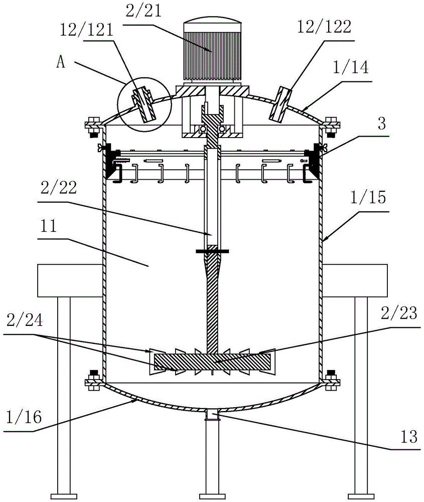 如图1所示,本实用新型公开了一种水性触感油墨的混合机,包括呈圆柱形的混合筒1及用于搅拌的搅拌装置2,且混合筒1的轴向呈竖向设置,其中,混合筒1内同轴开设有呈圆柱形的混合腔11,混合筒1上端设置有原料进口12,使得原材料可通过原料进口12倒入混合腔11进行混合准备,而混合筒1下端设置有成品出口13,使得完成搅拌的水墨从成品出口13排出而完成生产工作,另外,搅拌装置2包括搅拌电机21、搅拌转动杆22、转动盘23及若干搅拌叶片24,搅拌转动杆22的轴向与混合腔11同轴设置,且搅拌转动杆22通过轴承等方式沿周向转动设置于混合腔11内,转动盘23通过焊接等方式同轴固定安装于搅拌转动杆22竖向下端,各搅拌叶片24通过焊接等方式沿转动盘23的水平周向等间距固定设置于转动盘23上,搅拌电机21通过螺栓等方式固定安装于混合筒1上端,且搅拌电机21的输出轴沿竖向朝下贯穿进入混合腔11内,并与搅拌转动杆22通过键连接等方式固定连接,因此,采用搅拌电机21带动搅拌转动杆22转动,使得搅拌转动杆22带动转动盘23及搅拌叶片24转动,从而通过搅拌叶片24有效的将原材料进行搅拌混合。As shown in FIG. 1 , the present invention discloses a mixing machine for water-based tactile ink, comprising a