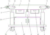 图中:1底板、2竖管、3活动杆、4工作台、5抽板、6导向块、7齿条、 8齿轮、9螺纹管、10螺纹杆、11从动齿轮、12主动齿轮、13转杆、14万向轮、15刹车块、16拉手、17导向槽、18转盘、19摇杆、20卡扣、21卡块、 22抽屉、23工具箱、24箱门。