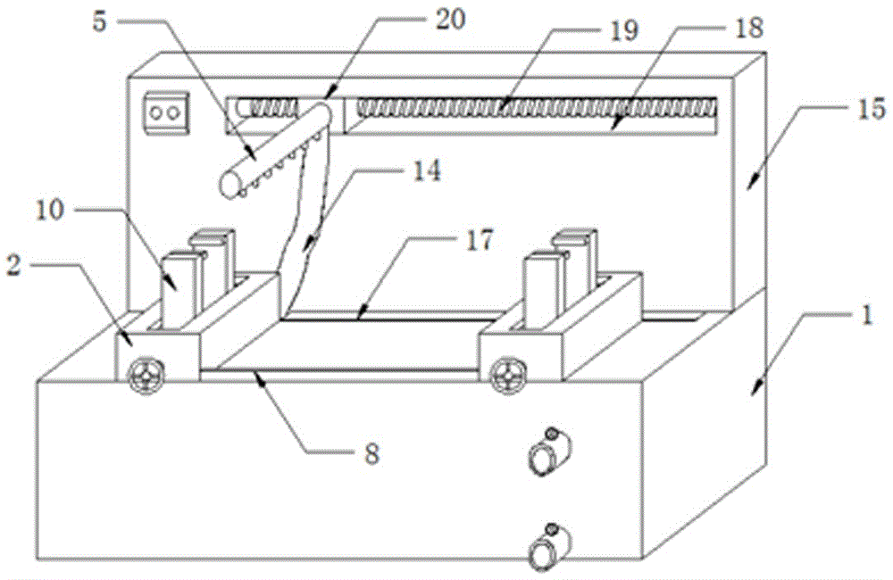 具体使用时,本实用新型一种高精密重型冲床导轨局部淬火装置,当需要使用该局部淬火装置时,首先将该局部淬火装置放置在工作地点,通过转动转把,带动第一丝杆3进行正向转动,配合第一丝杆螺母,使得相对应的两个移动块4同时做相对运动,带动夹紧板10进行摆动,从而便于对相关冲床导轨进行夹紧固定,然后通过相关喷火枪,对冲床导轨进行加热升温,通过正反转电机开关控制型号可为ZWL47FP的正反转电机16进行工作,正反转电机16的传动轴带动第二丝杆19进行正向转动,配合第二丝杆螺母和滑块20,调整横管5及喷头的位置,然后通过循环泵开关控制型号可为ISG40-125的循环泵12进行工作,通过出水软管14、抽水管13和横管5对加热处进行喷水淬火即可;淬火后的水体,通过漏水槽17流至储水箱11内,实现水资源的循环利用;最后将局部淬火后的冲床导轨进行取下即可(只需反向转动转把,重复上述步骤)。In specific use, the utility model is a local quenching device for the guide rail of a high-precision heavy-duty punch. When the local quenching device needs to be used, the local quenching device is first placed at the work site, and the