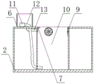图1-4中:1-料槽;2-打印平台;3-Z轴立柱;4-Y轴电机;5-Y轴丝杆; 6-水箱;7-弹簧阀门;8-Y轴防护壳;9-热风扇;10-清洗槽;11-水泵;12- 抽水管;13-进水管。