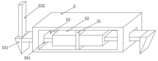 Referring to fig. 2 and 3, a support 4 is detachably connected with a housing 1, the support 4 is provided with two symmetrically distributed grooves 41, two ends of the bottom of the housing 1 are both fixedly connected with mounting blocks 5, the inner walls of the mounting blocks 5 are fixedly connected with partition plates 51, two sides of the outer wall of each partition plate 51 are both fixedly connected with mounting tables 52, and push rods 53 are slidably connected in the two mounting tables 52; specifically, the inner walls of the two grooves 41 are fixedly connected with two clamping blocks 42 which are symmetrically distributed; specifically, the mounting table 52 is elastically connected with the push rod 53 through a compression spring 502; specifically, through grooves 501 are formed in both ends of the mounting block 5, and the two push rods 53 are slidably connected with the two through grooves 501 respectively; the partition plate 51 is used for fixedly mounting the mounting table 52, and the through groove 501 is used for sliding the push rod 53, so that the push rod 53 is not blocked by the mounting block 5; when in installation, the two installation blocks 5 at the two ends of the shell 1 are aligned with the groove 41, then the installation blocks 5 are pressed into the groove 41, when the limiting block 531 contacts the fixture block 42 during pressing, the limiting block 531 plays a role in guiding, push rod 53 is extruded by the outer wall of fixture block 42 when descending through the direction of limiting block 531, compression spring 502 between push rod 53 and mount table 52 contracts because of the extrusion of the outer wall of fixture block 42 at this moment, until limiting block 531 is located the bottom of fixture block 42 and no longer contacts with the outer wall of fixture block 42, make push rod 53 no longer receive the extrusion of fixture block 42, compression spring 502 between push rod 53 and mount table 52 rebounds this moment, drive push rod 53 and limiting block 531 to promote to the normal position, make the distance between two limiting blocks 531 increase, push rod 53 and limiting block 531 receive the spacing of top fixture block 42 this moment, make mounting block 5 can't deviate from among recess 41, accomplish the installation to casing 1.