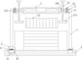 Referring to fig. 1, two screws 21 are fixed to an installation plate 2 in a threaded manner, the screws 21 both penetrate through the installation plate 2, a heat dissipation fan 3 is fixedly connected to the center of the installation plate 2, and the heat dissipation fan 3 is electrically connected to an external power supply; specifically, the mounting plate 2 is provided with two threaded holes 201, the two screws 21 are respectively screwed and fixed with the two threaded holes 201, and one ends of the two screws 21 located in the shell 1 are fixedly connected with fixing blocks 211; after the mounting plate 2 is mounted, the screw 21 of the threaded hole 201 is screwed clockwise, so that the screw 21 moves downwards under the influence of the threads of the threaded hole 201 until the fixing block 211 contacts the equipment, the equipment is pushed and fixed, and the stability of the equipment placed on the upper end of the support 4 is improved.